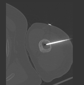 CT-guided aspiration of the bone marrow was done from the left humerus mild diaphyseal region in a supine position under local anesthesia.