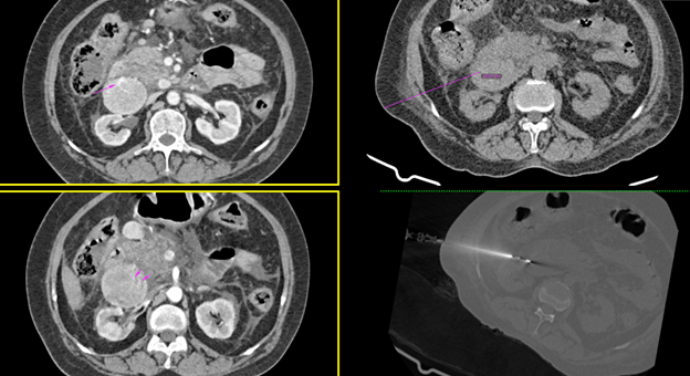 55 Y/ Female patient with abdominal pain with two avidly enhancing lesions with increased vascularity were noted just posterior to the duodenum.